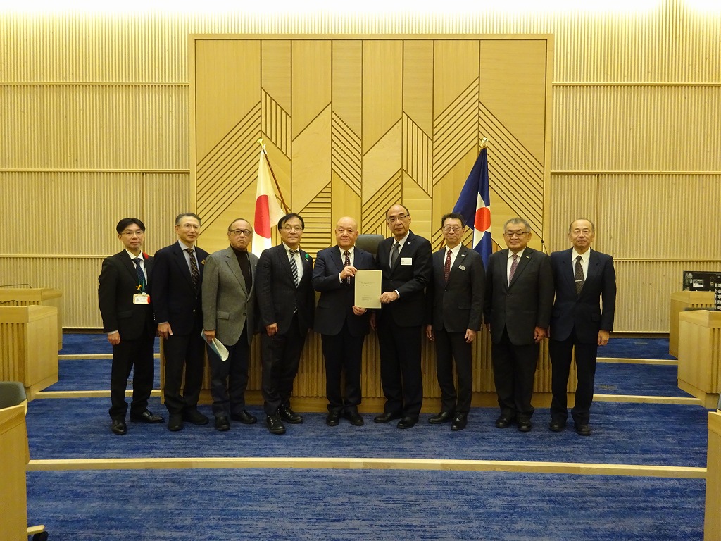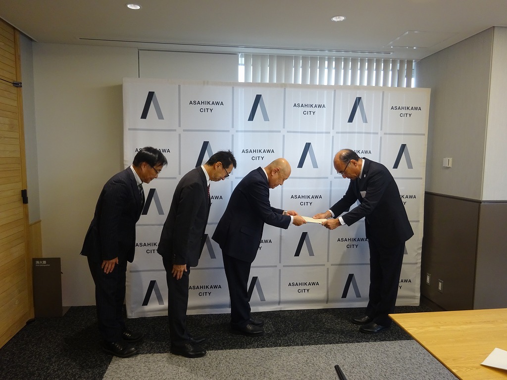 旭川市における今後検討中の施設に対し道産木材の利用を働きかけるもので、菅野副市長に対し道木連 三津橋会長、北海道森林組合連合会 根布谷副理事から要望書が手渡されました。