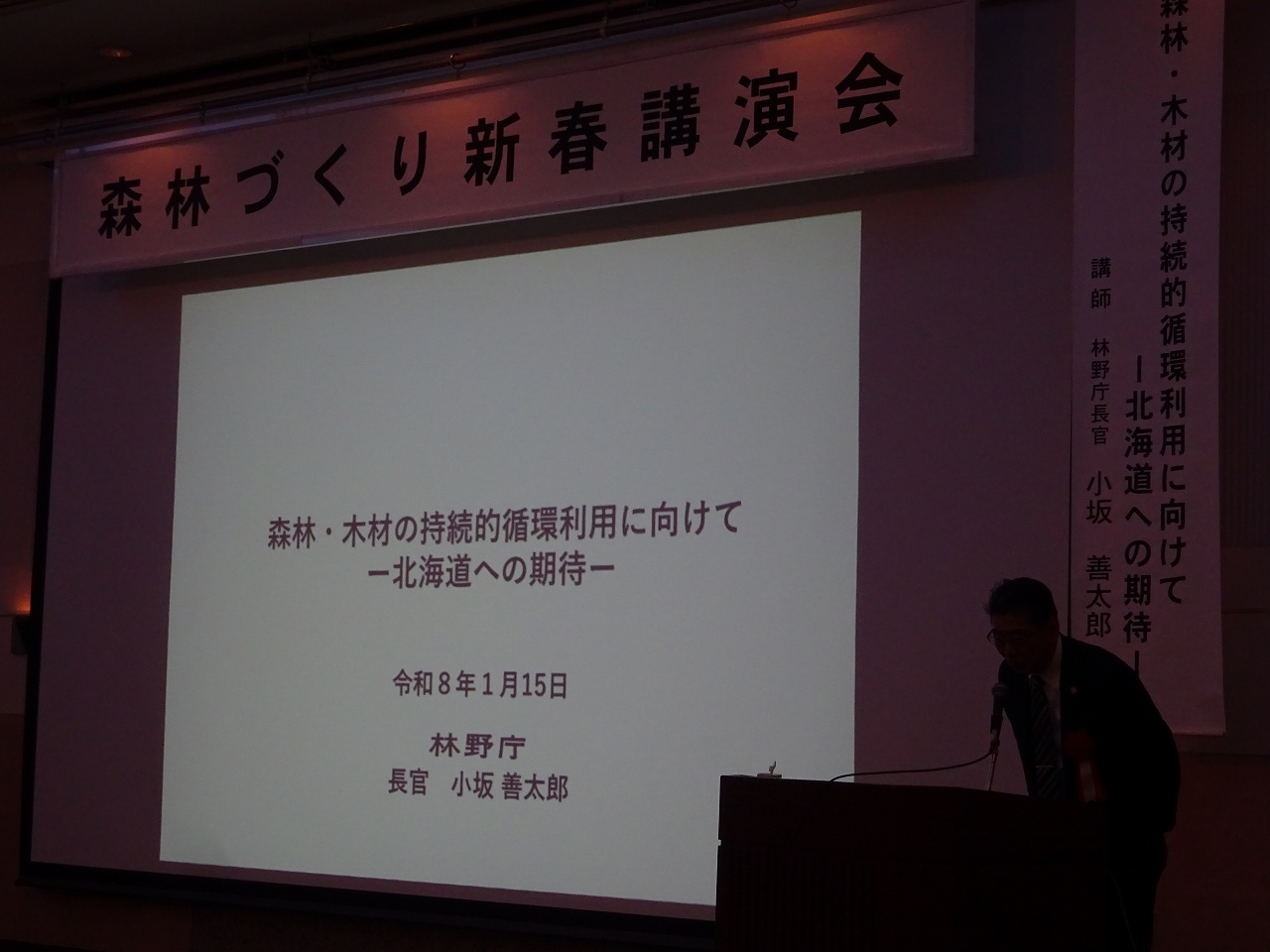 講師に林野庁長官 小坂 善太郎 氏をお招きし「森林・木材の持続的循環利用に向けてー北海道への期待―」と題し、将来に向けた持続的環境林業のための造林ルールの明確化や林業経営・儲かる林業などの山づくり、また、木材・木製品の利用拡大に向けたサプライチェーンの更なる連携と非住宅の建物への積極的な利用の働きかけなど、林産業の現状と課題を国有林の立場からご講演いただきました。