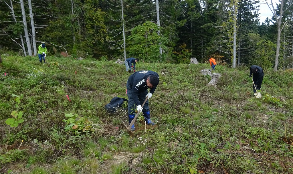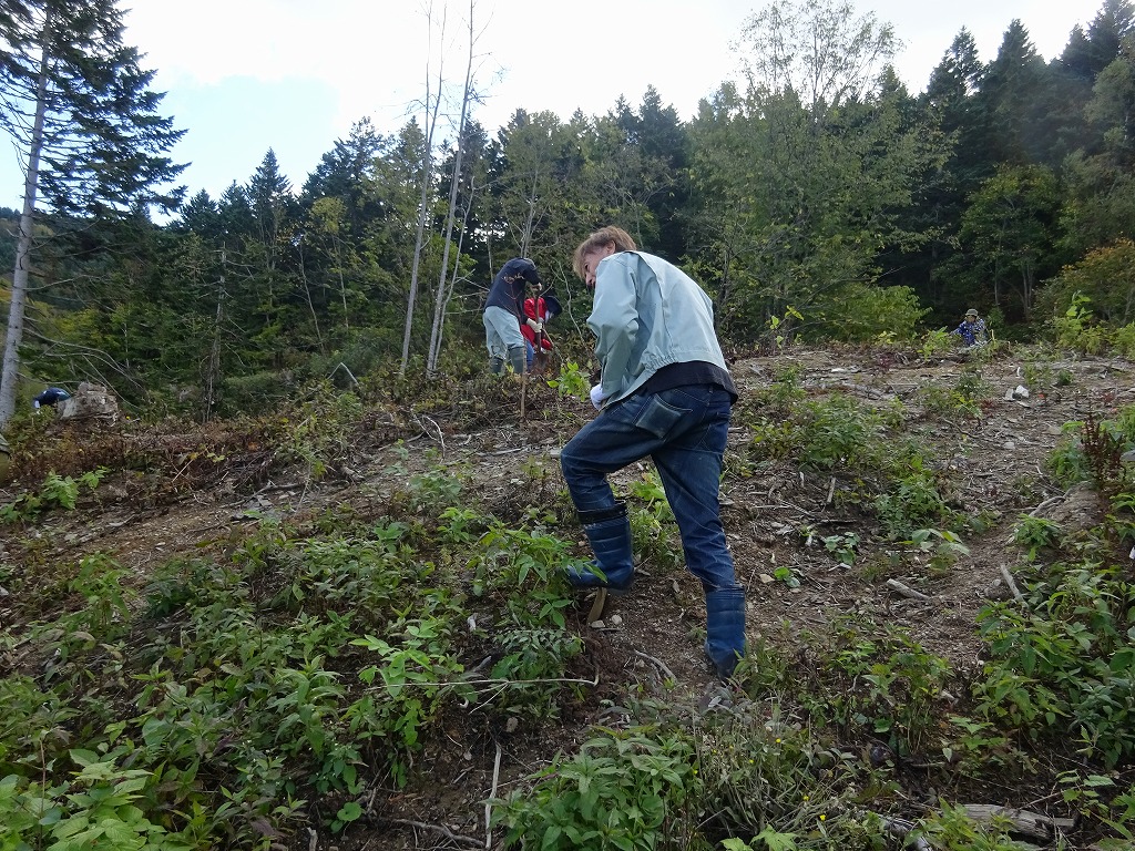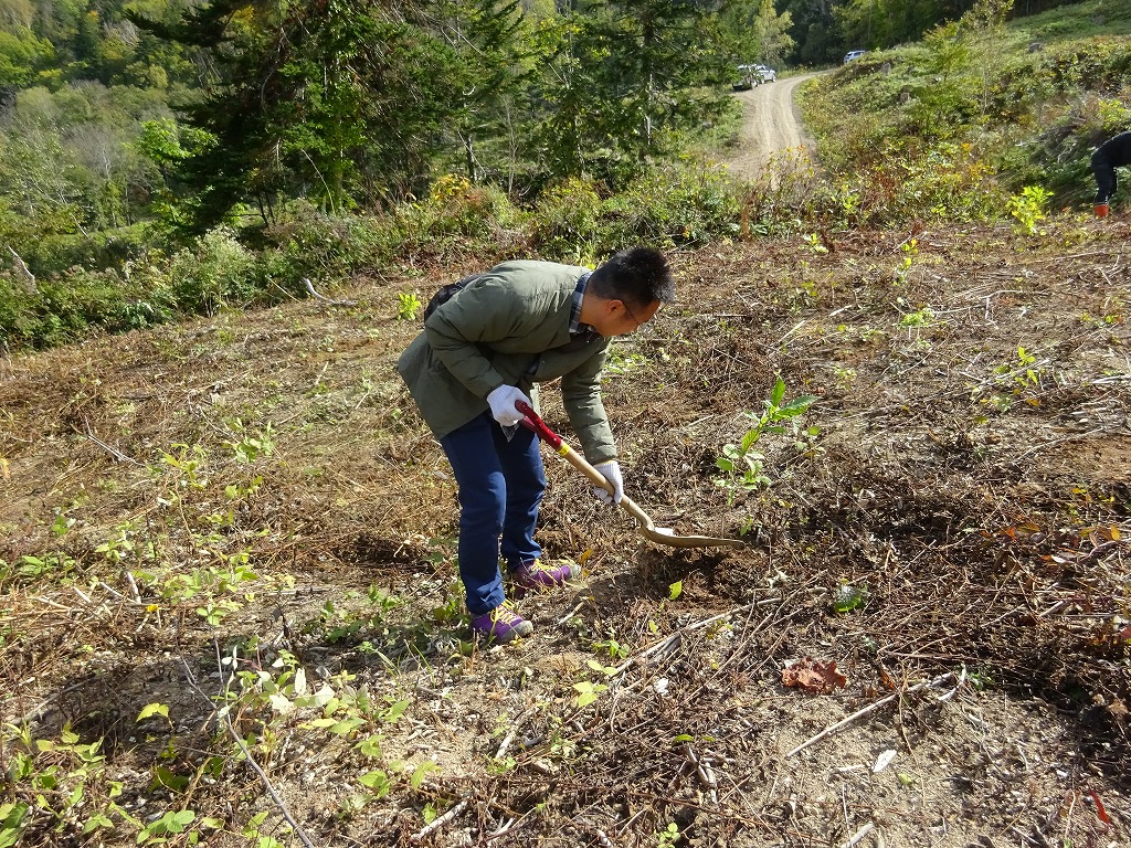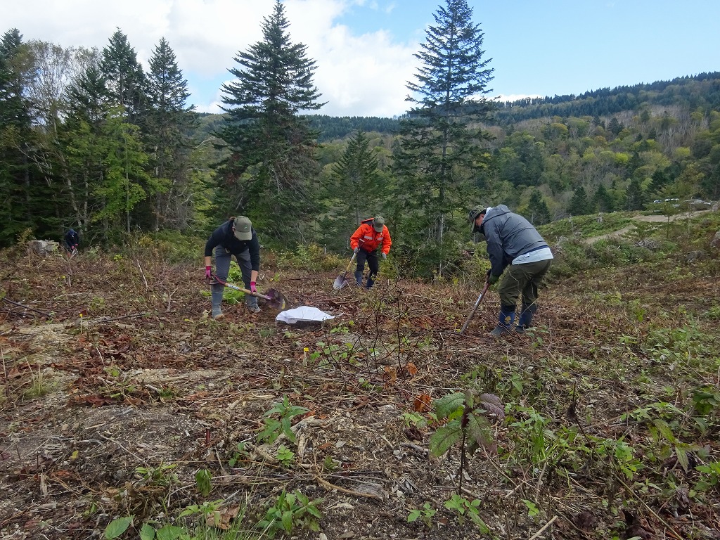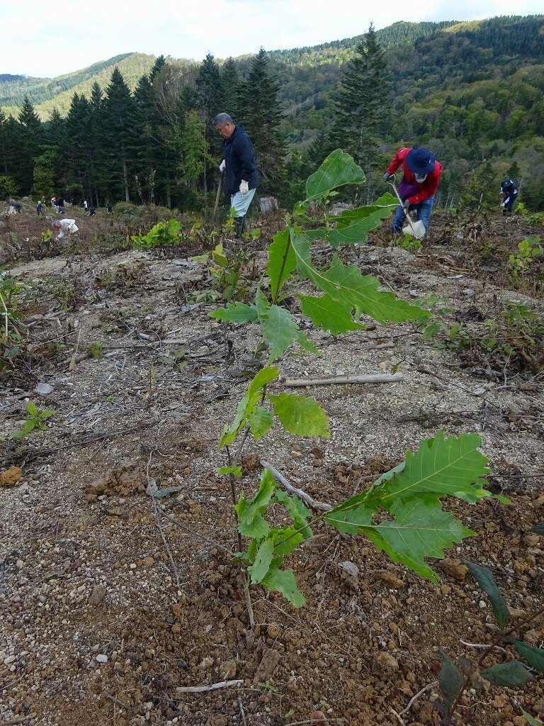 地盤が固く掘る作業に苦戦しながらも、用意したミズナラの苗木1,050本すべて植え付けることができました。